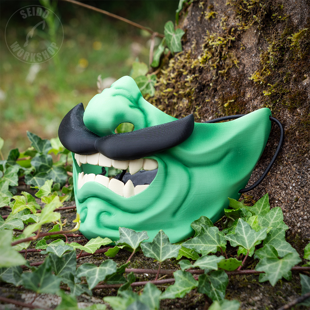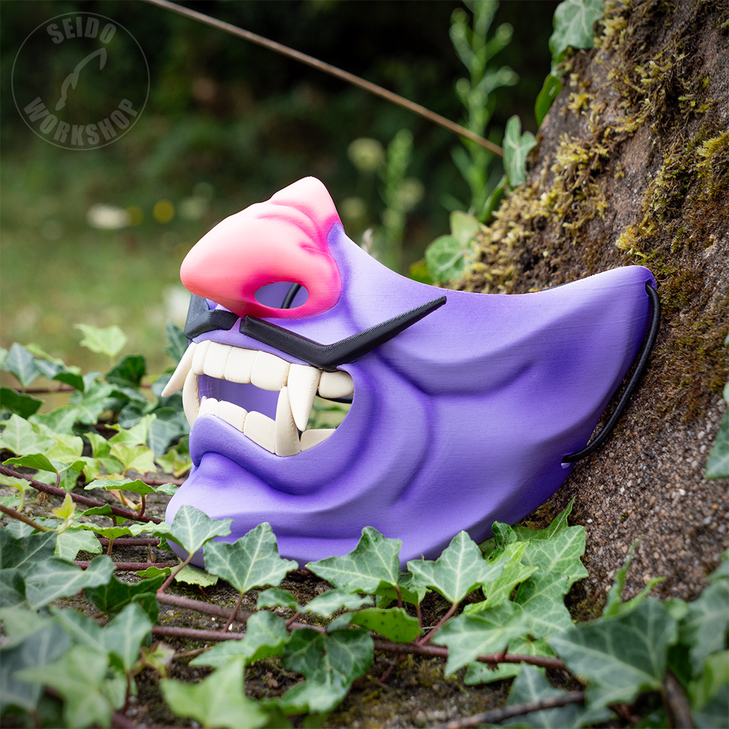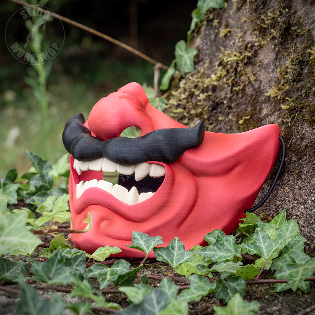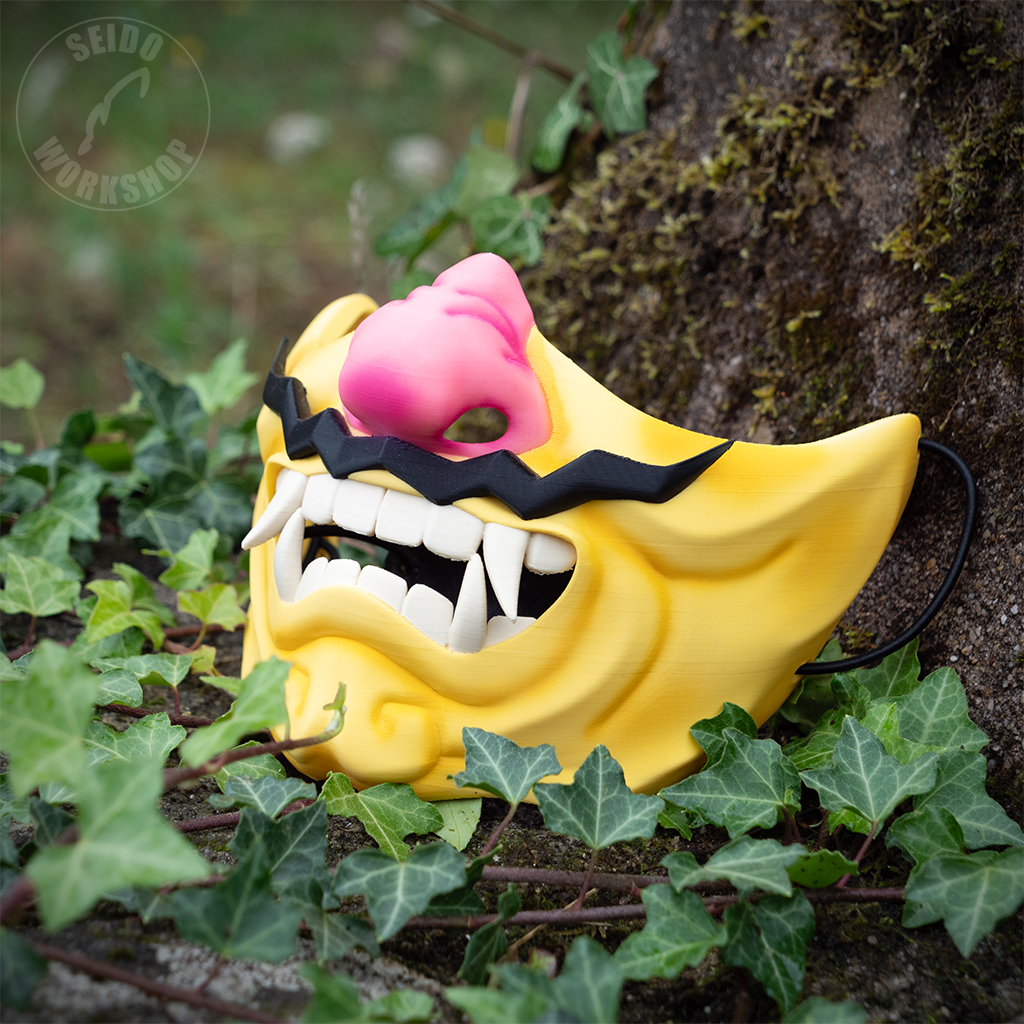 Masque Mempo inspiré de l’univers Mario. Design original modélisé sur Blender, imprimé en 3D et peint à l’aérographe. Confort ajustable grâce à sa fixation flexible. Idéal pour cosplay et collection !