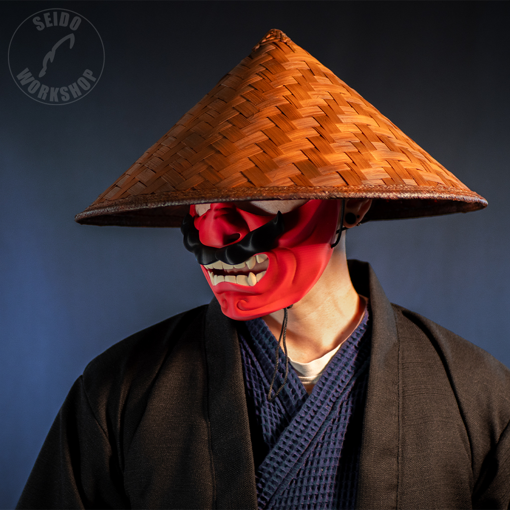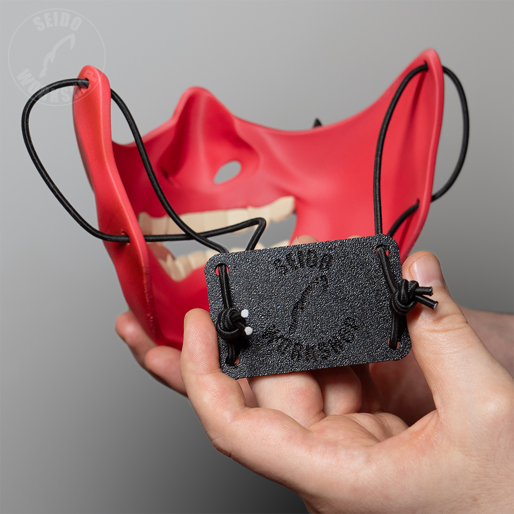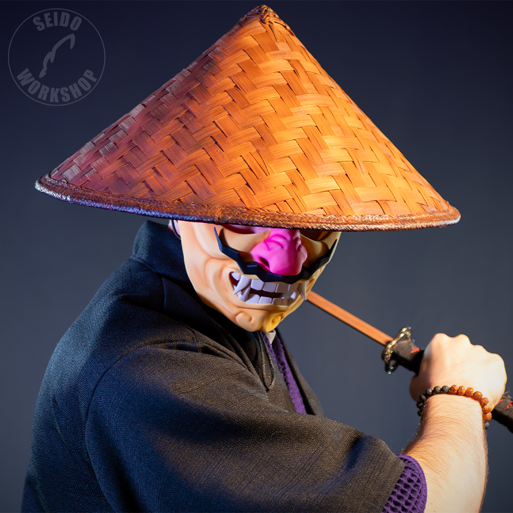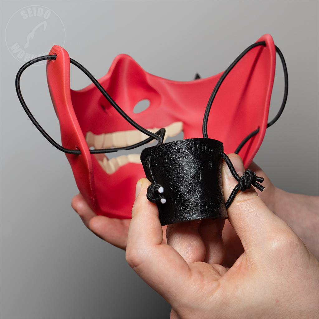 Masque Mempo inspiré de l’univers Mario. Design original modélisé sur Blender, imprimé en 3D et peint à l’aérographe. Confort ajustable grâce à sa fixation flexible. Idéal pour cosplay et collection !